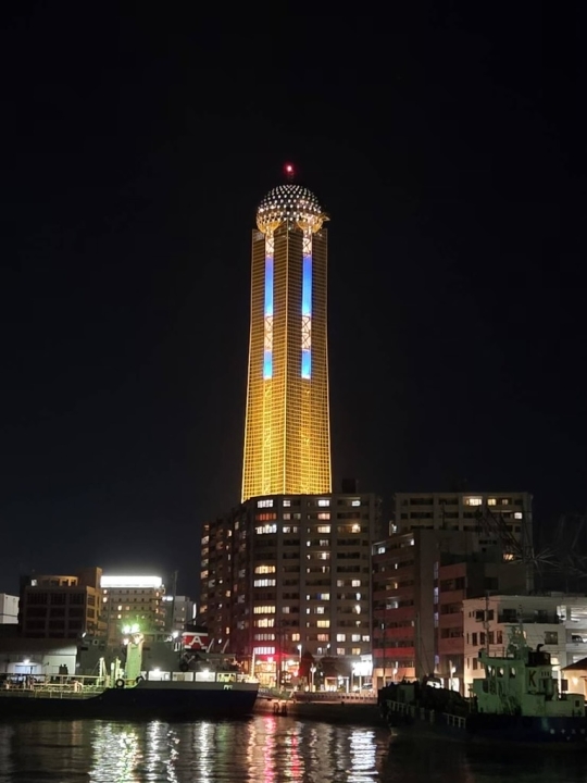 インディゴブルーにライトアップしました。